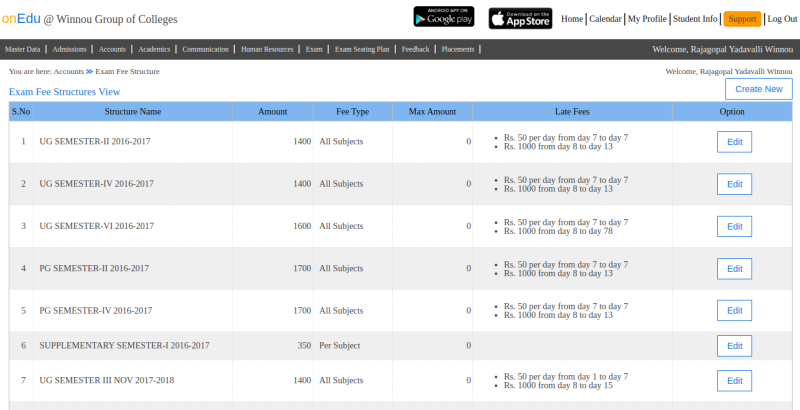 Note: The edit of fees will be available to user based on the permission given by the accounts team at the time of creating the fee structure. Audit trail of edits done to the fee structures are available.