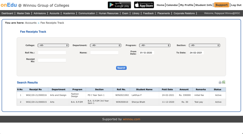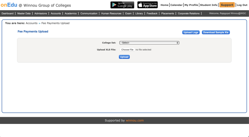 This screen allows the accounts team to upload the previous semester fee receipts into the system. By default, winnou team will upload all the previous receipts into the system t the time of implementation process.