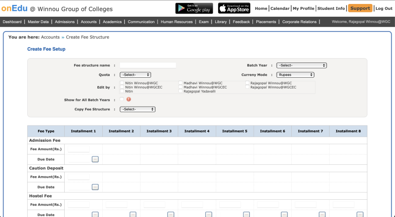 This screens allow the accounts team to create fee structures that can then be assigned to students. A fee structure consists of a list of fee types, along with amount and due dates for each instalment of each fee type. This is essentially a calendar of what fees to be paid, how much to be paid and when it has to be paid.
