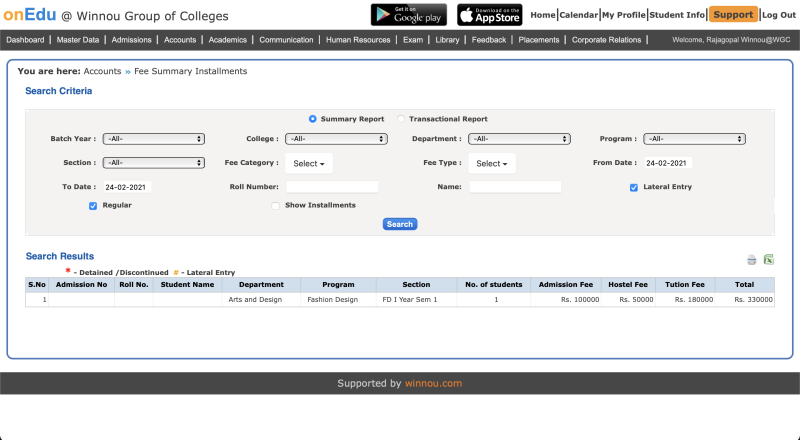 This report is specially developed for ICFAI University, In addition to regular 'Fee Summary Report' it also allows you to view the program fee paid by student for all the semester.