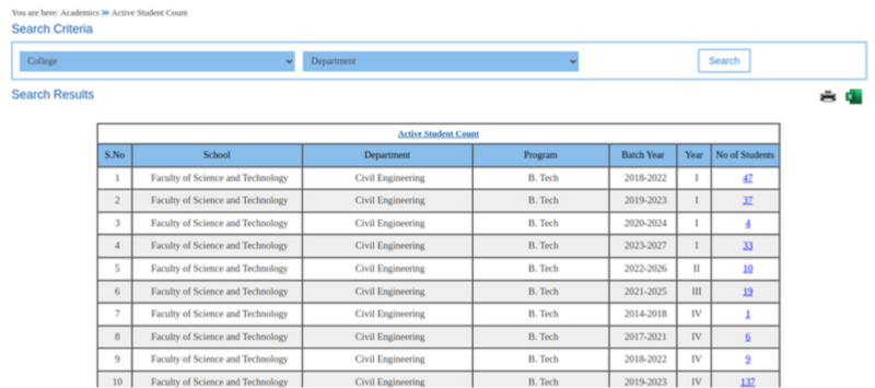 The search results will display the count of active students for the particular school, department, program, batch year, and year.