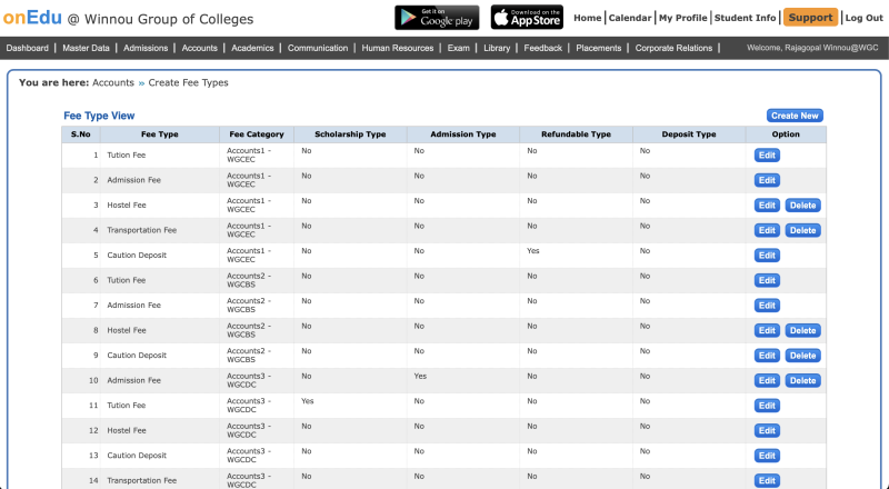 Create new will help you to select a particular college and add an associated fee category to it. This will allow you to filter the data in most of the account related reports.