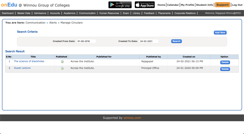 Menu Navigation: Communication → Alerts → Manage Circulars