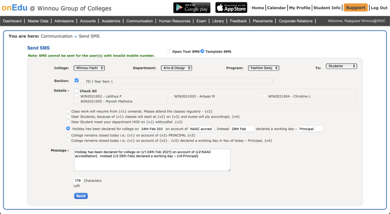 onEdu is integrated with SMS gateways and can be used to push alerts to students, staff and parents. Open text SMS can be sent at present, but this may be discontinued in the near future based on TRAI govt regulations.