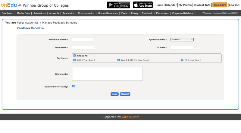 - Setup Feedback Schedule: Now define the active terms to administer the questionnaire and the date and time range for it.