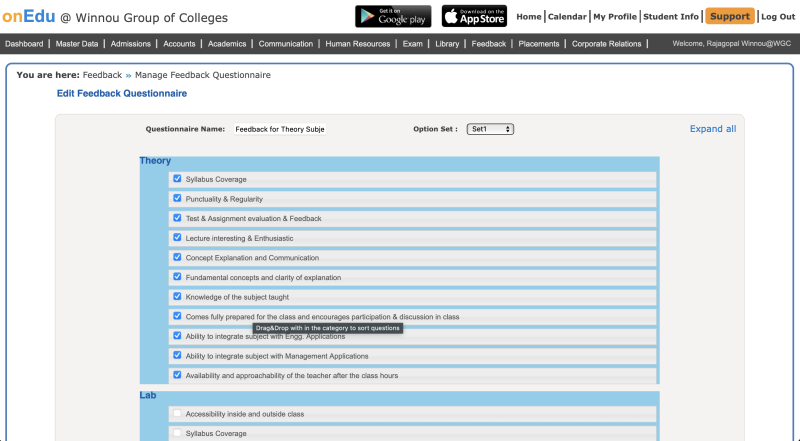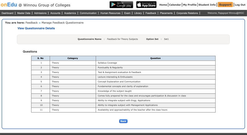A very detailed oriented report for the management which displays the complete feedback profile of staff members. Feedbacks are differentiated based on their schedules. Upon viewing the detailed level of a feedback schedule, we get access to feedback data based on sections & subjects.