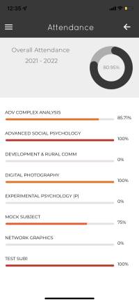This screen allows the student to review their attendance (both overall and individual course wise). The overall attendance percentage across all active courses for the term is presented as a doughnut graph at the top, and each individual course wise attendance percentage is plotted as a progress bar graph. The courses are listed in alphabetical order.