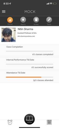 This section presents a bar graph with a progress bar indicating the % of classes that are completed of the planned classes. Upon touch, this takes the student a detail screen displaying the classes conducted till date and planned in the future for rest of the term. The detail includes date of class (conducted or planned), topic planned and topic taught.