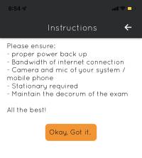 When a test is be opened by a student by touching it on their mobile app, they are presented with the instructions for the test as defined on the Exam Schedule by the faculty. When reattempt flag on the blue print is set to 'Yes', a student will be able to open completed tests. Else tests can only be opened till they are completed or till their end date/time as scheduled in the Exam Schedule.