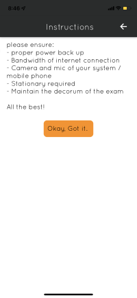 When a test is be opened by a student by touching it on their mobile app, they are presented with the instructions for the test as defined on the Exam Schedule by the faculty. When reattempt flag on the blue print is set to 'Yes', a student will be able to open completed tests. Else tests can only be opened till they are completed or till their end date/time as scheduled in the Exam Schedule.