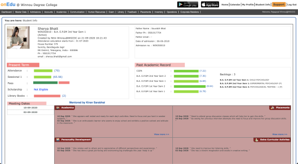 One of the highlights of the system is its 360 degree view of the student. This is where all student related information is brought together to be displayed to parents, faculty and management in a crisp, clear and tabulated screen. It is built as a one stop area to obtain every bit of information about a student right from the date of joining the institution to their last college day.